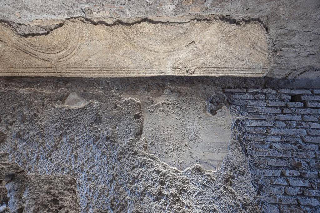 ภายในอุโมงค์ยังคงมีร่องรอยของแผ่นหินอ่อนที่เคยประดับผนัง โดยสามารถเห็นช่องโลหะที่เคยใช้ยึดแผ่นหิน ซึ่งภายหลังถูกแทนที่ด้วยปูนฉาบและภาพจิตรกรรมฝาผนังแนวภูมิทัศน์ ขณะที่ระหว่างทางเดินยังมีงานปูนปั้นลวดลายเรื่องราวจากตำนานเทพเจ้าดิออนิซัสและอาเรียนนา