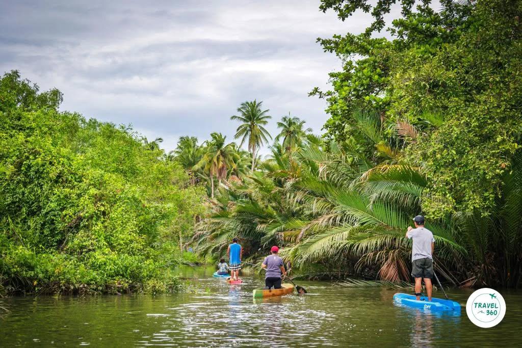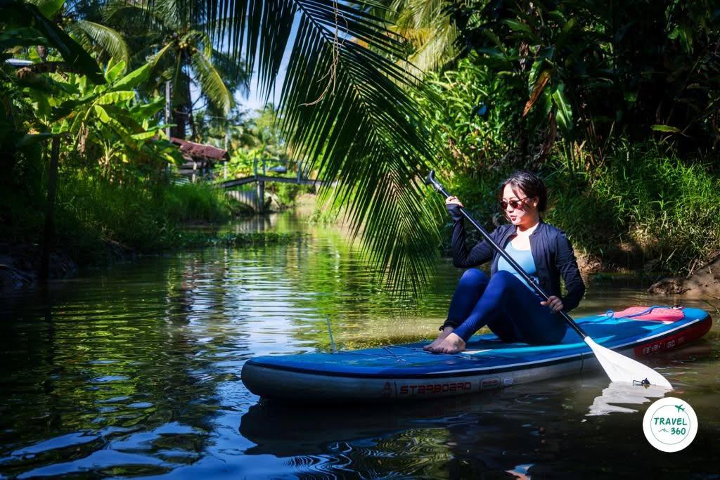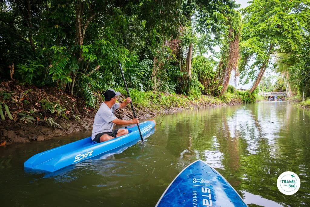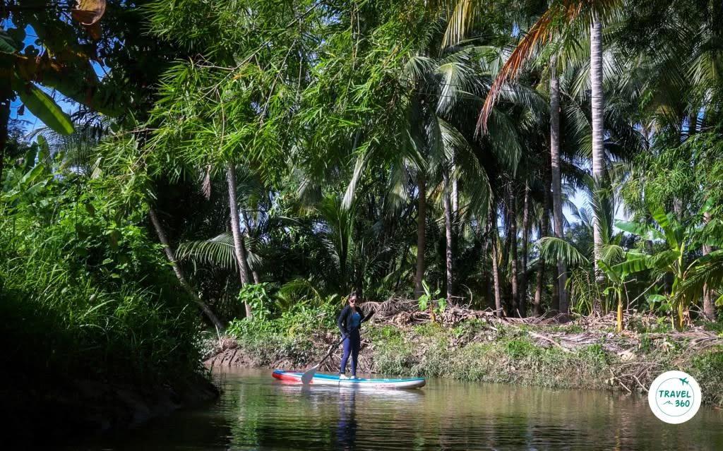 “ซับบอร์ด” เคลื่อนคล้อยลอยบนผิวน้ำอย่างอ้อยอิ่ง ผ่านไปตามร่องน้ำขนาดกว้างไม่กี่เมตรที่โอบขนาบความเขียวขจีของพืชพันธุ์ตามธรรมชาติเบียดเสียดสูงต่ำสลับกลมกลืนกับพืชเกษตรกรรมในสวนริมคลอง ร่มเงาจากพลังสีเขียวสองฟากฝั่งปล่อยความสดชื่นราวร่ายมนต์สะกด มีเสียงทักทายจากชาวบ้านท้องถิ่นถามไถ่เป็นระยะ พร้อมๆกับบางช่วงที่เสียงสุนัขเฝ้าสวนเห่ากันเกรียวเมื่อเห็นแขกแปลกหน้าพายอุปกรณ์สีสันสดใสล่องผ่านคุ้งน้ำ