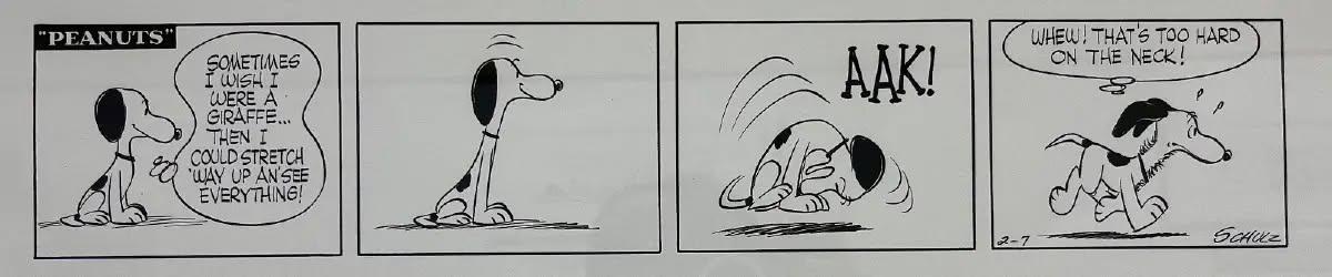 คอมิกส์พีนัทส์ 7 ก.พ.1956 สนูปปี้เริ่มโตแต่ยังเดินสี่ขา : บางครั้งฉันก็หวังว่าจะเป็นยีราฟ ฉันจะได้ยืดสูงขึ้นดูทุกอย่าง อ๊ากก! วู้! นั่นมากเกินไปสำหรับคอ!
