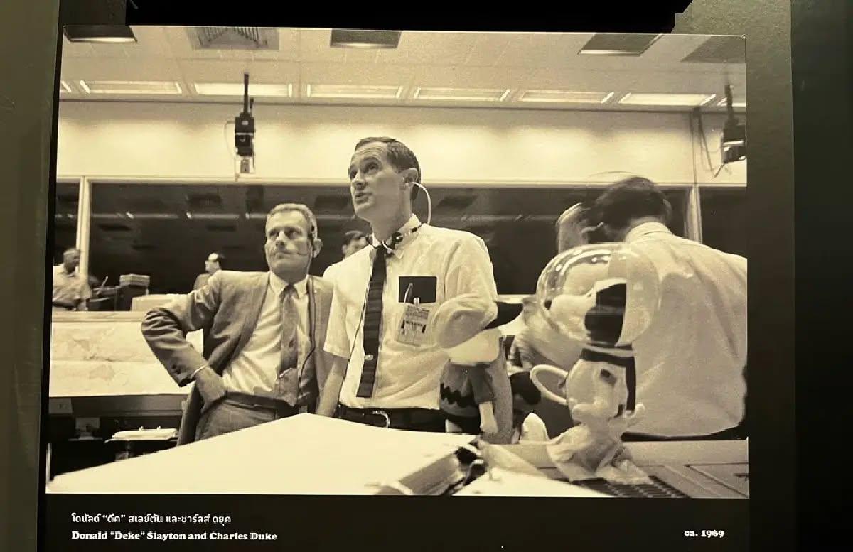 โดนัลด์ “ดีค” สเลย์ตัน ผู้อำนวยการด้านปฏิบัติการของลูกเรือ NASA และนักบินอวกาศชาร์ลส์ ดยุค พร้อมตุ๊กตาสนูปปี้และชาร์ลี บราวน์ วางเด่นอยู่ที่ศูนย์บัญชาการภารกิจในฮุสตัน รัฐเท็กซัส