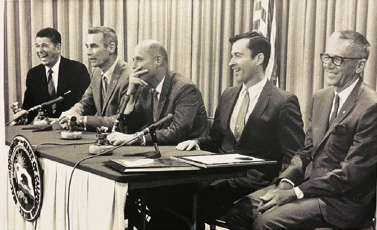 โรนัลด์ เรแกน, ชาร์ลส์ เอ็ม. ชูลซ์ และนักบินอวกาศจากภารกิจ Apollo 10 ในงานแถลงข่าวที่เมืองแซคราเมนโต รัฐแคลิฟอร์เนีย มิถุนายน ค.ศ.1969