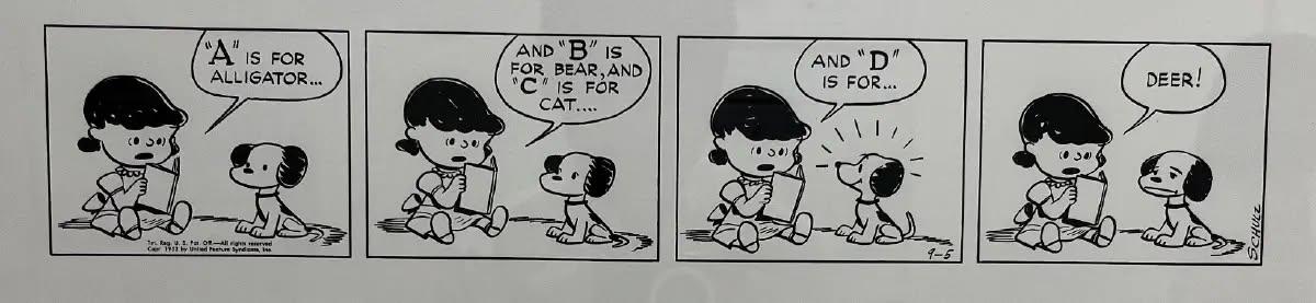 คอมิกส์พีนัทส์ 5 ก.ย.1952 สนูปปี้ยังเป็นลูกสุนัข : A สำหรับ Alligator จระเข้, B สำหรับ Bear หมี และ C สำหรับ Cat แมว, และ D สำหรับ... Deer กวาง