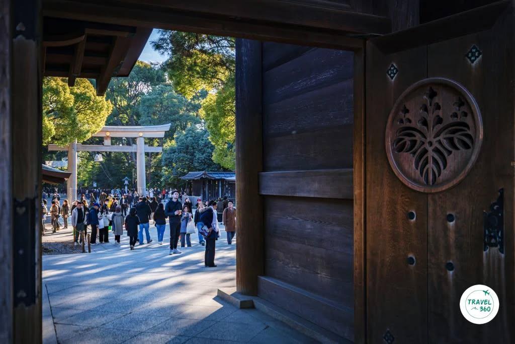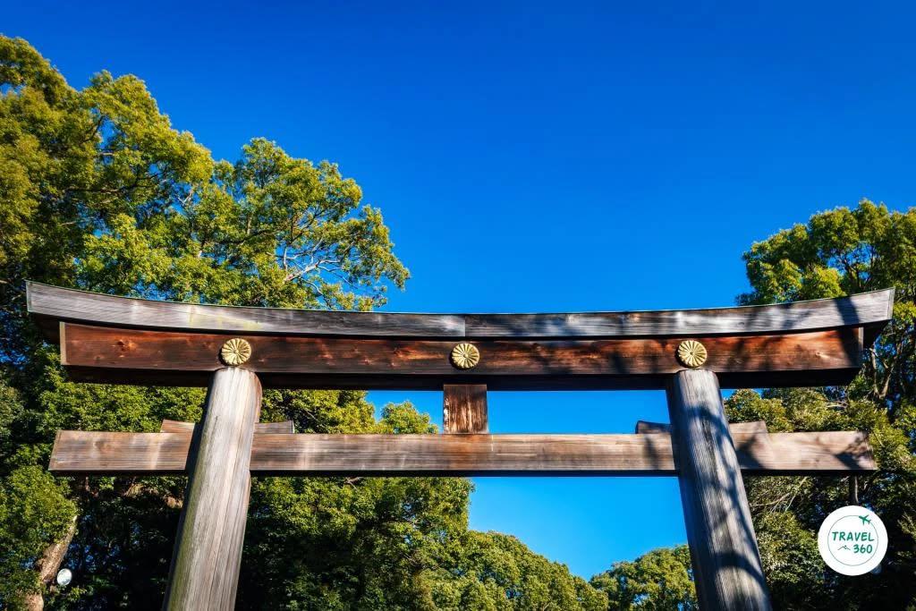 เสาโทริอิไม้สูงใหญ่ตระหง่านเป็นสัญลักษณ์บอกความเป็นศาลเจ้า โดยปรากฏตราดอกเบญจมาศสีทองสัญลักษณ์ของราชวงศ์ญี่ปุ่นย้ำให้ผู้มาเยือนได้รับรู้ว่า “ศาลเจ้าเมจิ” ที่รายล้อมด้วยความร่มรื่นของแมกไม้ใจกลางเมือง มีความเกี่ยวข้องกับราชวงศ์แห่งดินแดนอาทิตย์อุทัย