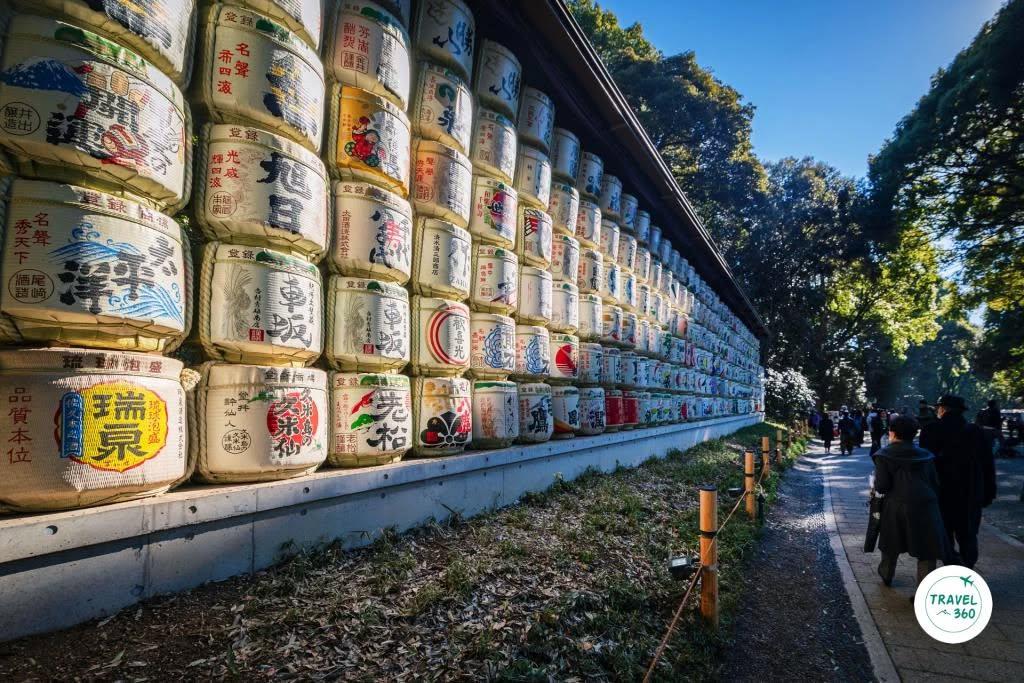 นอกจากเสาไม้โทริอิขนาดใหญ่ที่เป็นสัญลักษณ์ว่าเป็นเขตศาลเจ้าชินโต รวมทั้งผืนป่าร่มรื่นสองข้างทาง หนึ่งในจุดสังเกตและเป็นจุดแวะถ่ายภาพยอดนิยมของนักท่องเที่ยว คือ “ถังสาเก กับถังไวน์” ที่อยู่ระหว่างทางเข้าศาลเจ้า