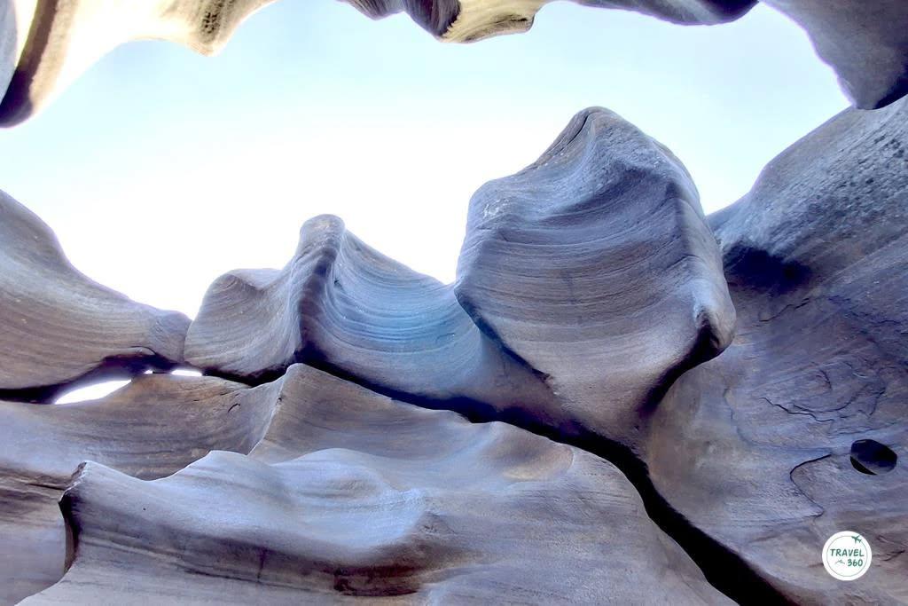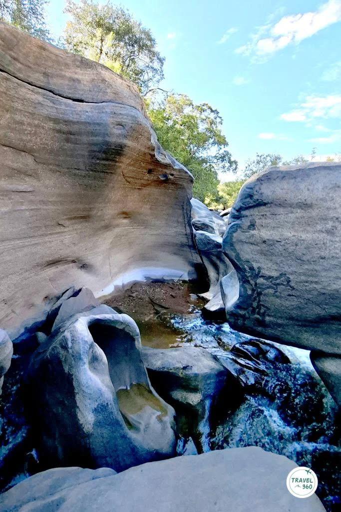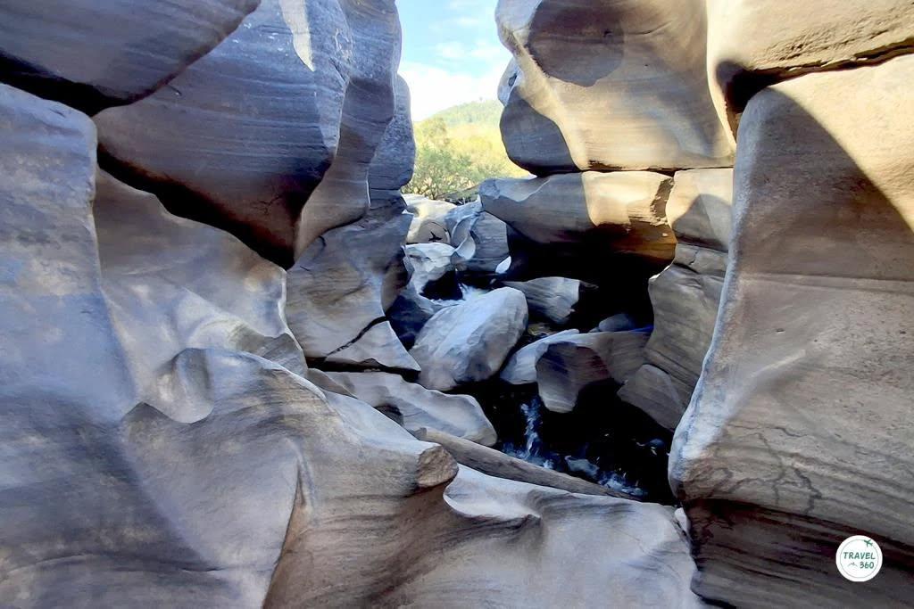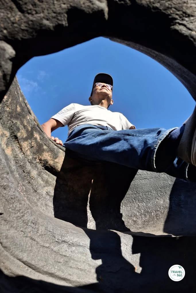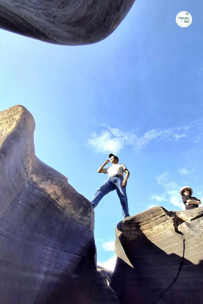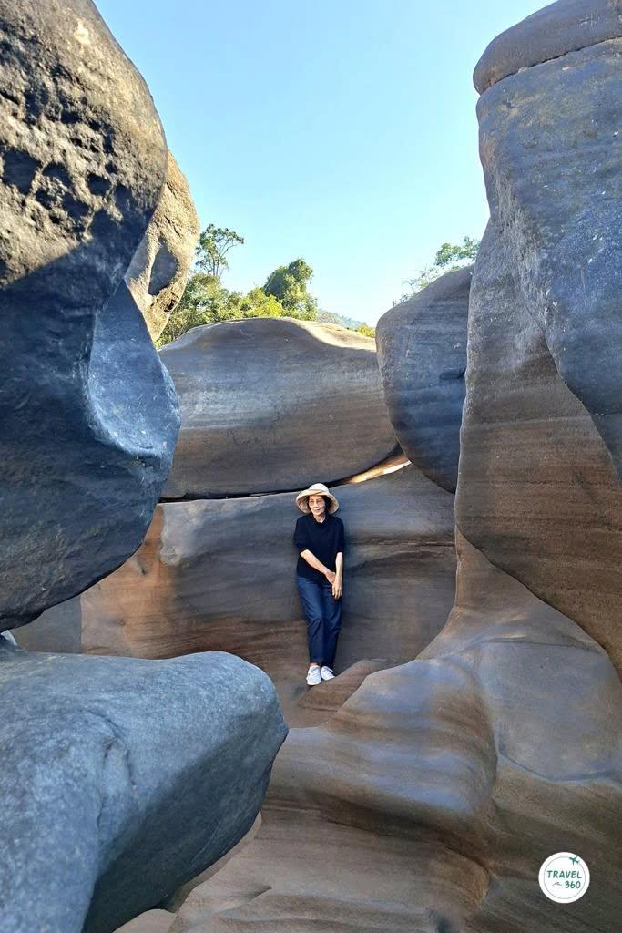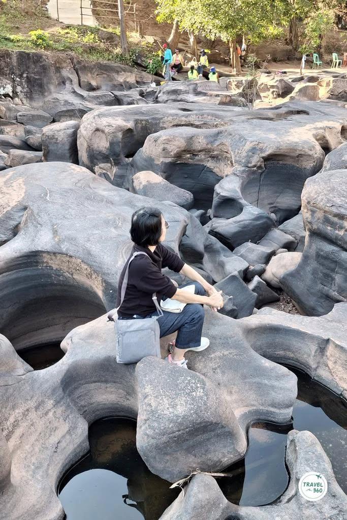 หากไปถึงที่เลยดั้น ก็จะเห็นภาพของลานหินกว้างที่เต็มไปด้วยหลุมรูปร่างต่างๆ กัน ทั้งหลุมเล็กหลุมใหญ่ ไปจนถึงเส้นสายตามชั้นของหินที่คล้ายกับว่ามีคนมาสลักไว้ พื้นที่หน้าตาแบบนี้ อาจจะเคยเห็นกันที่ สามพันโบก จ.อุบลราชธานี ซึ่งการเกิดขึ้นของประติมากรรมจากธรรมชาติลักษณะนี้ ก็มีที่มาในแบบเดียวกัน