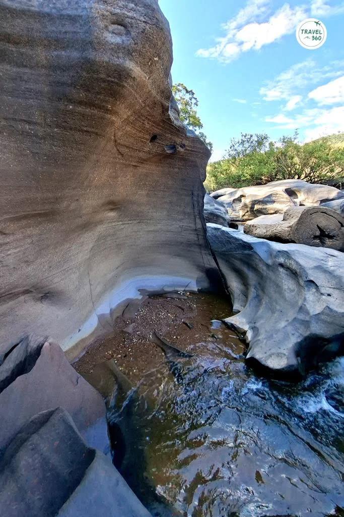สำหรับ “กุมภลักษณ์” หรือ หลุมรูปหม้อ เกิดจากกระบวนการกร่อนจากลำน้ำที่ไหลผ่านชั้นหินที่อยู่ใต้น้ำ โดยเฉพาะหินทราย เม็ดกรวดเม็ดทรายที่ไหลมากับลำน้ำผ่านชั้นหินเกิดการหมุนวนทำให้เกิดเป็นหลุมเล็กๆ และเมื่อเวลาผ่านไปหลายร้อยปี หลายพันปี เม็ดกรวดเม็ดทรายที่อยู่ก้นหลุมก็หมุนวนขยายหลุมให้ใหญ่ขึ้น (เม็ดกรวดเม็ดทรายทำหน้าที่เหมือนสว่านเจาะหิน) เกิดเป็นหลุมขนาดใหญ่และเชื่อมต่อกันหลายๆ หลุมจนกลายเป็นดั่งประติมากรรมหินทรายที่มีรูปร่างแปลกตาตามจินตนาการของผู้ที่มองเห็น