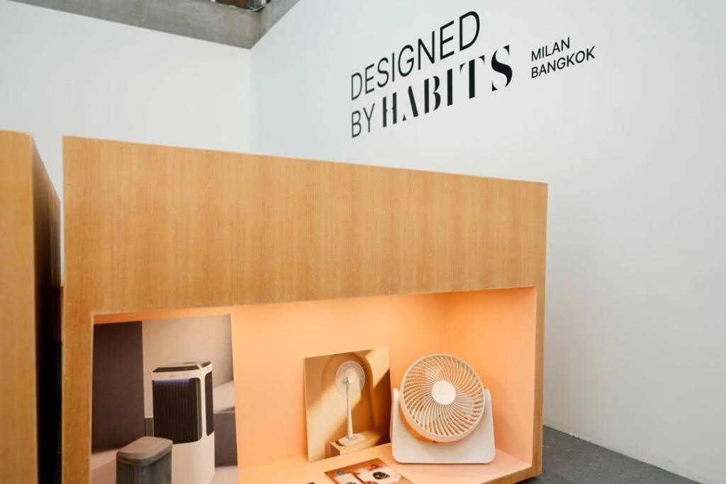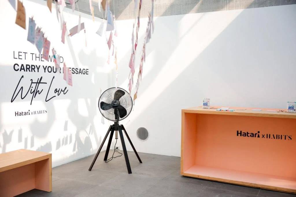 นิทรรศการ “Love Is in the Air” ชวนทุกคนตั้งคำถามว่า “การออกแบบของใช้ในชีวิตประจำวันจะมอบประโยชน์ใช้สอย และสุนทรียภาพทางความรู้สึกในใจของเราไปพร้อมกันได้อย่างไร” โดยได้แรงบันดาลใจจากการเล่นคำในภาษาไทยอย่างคำว่า “แฟน” ซึ่งพ้องเสียงกับ “FAN” ที่หมายถึงพัดลมในภาษาอังกฤษ นิทรรศการครั้งนี้จึงนำเสนอพัดลมที่ไม่ได้เป็นเพียงเครื่องใช้ไฟฟ้า แต่เป็น “FAN” ที่คอยอยู่เคียงข้างเราในทุกช่วงเวลาของชีวิต ซึ่งสะท้อนแนวคิด ของฮาตาริที่ต้องการให้การออกแบบเป็นมากกว่าฟังก์ชัน แต่ยังเป็นเพื่อนร่วมทางทางอารมณ์และความรู้สึก จึงได้ร่วมงานกับ Habits Design Studio สตูดิโอออกแบบสหสาขาวิชาชีพจากประเทศอิตาลี ซึ่งมีความเชี่ยวชาญในการเชื่อมโยง ดีไซน์ ฟังก์ชันการใช้งาน และธรรมชาติ เข้าด้วยกัน