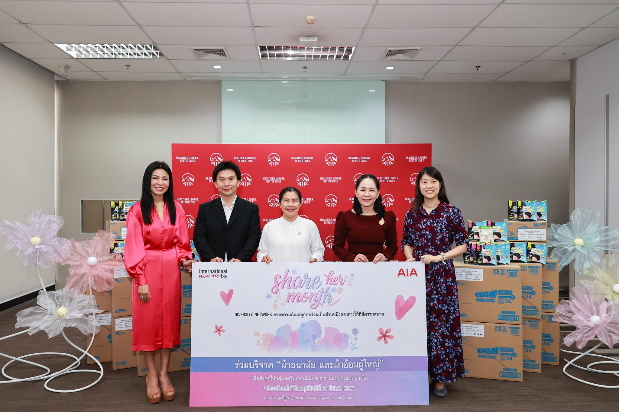 เอไอเอ ประเทศไทย นำโดย นางศรัณยา เทียนถาวร (ที่ 2 จากขวา) ประธานเจ้าหน้าที่ฝ่ายทรัพยากรบุคคล นางสาวชลิดา นครชัย (ขวา) ประธานเจ้าหน้าที่ฝ่ายการตลาด และ นางสาวรพีพร วงศ์ทองคำ (ซ้าย) ผู้อำนวยการฝ่ายสื่อสารองค์กรและภาพลักษณ์ พร้อมคณะผู้บริหาร จัดแคมเปญเพื่อสังคม “SHARE HER MONTH” ภายใต้แนวคิด “Give to Gain: ให้เพื่อได้รับ” เพื่อตอกย้ำความมุ่งมั่นในการส่งเสริมให้ผู้คนมีสุขภาพและชีวิตที่ดีขึ้น ตามคำมั่นสัญญา “Healthier, Longer, Better Lives” ผ่านการขับเคลื่อนด้านความรับผิดชอบต่อสังคม (ESG) และหลักการ DEIB ได้แก่ ความหลากหลาย (Diversity) ความเสมอภาค (Equity) การมีส่วนร่วม (Inclusion) และความรู้สึกเป็นส่วนหนึ่ง (Belonging) อย่างเป็นรูปธรรม
