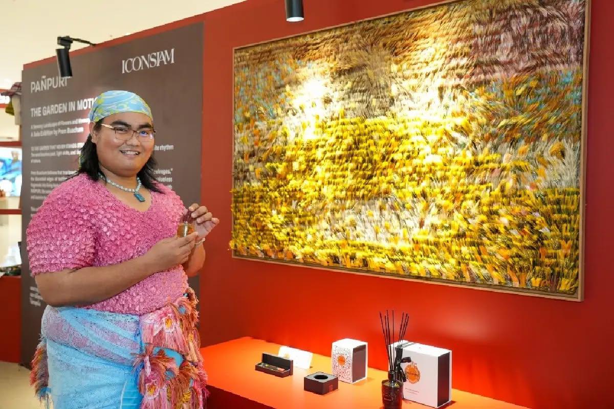 เปรม บัวชุม กับผลงาน ‘ละอองความทรงจำ : มนต์สะกดแห่งมิโมซ่า’ และเครื่องหอมจากกลิ่นดอกไม้มิโมซ่าของปัญญ์ปุริ (ภาพ : ไอคอนสยาม)
